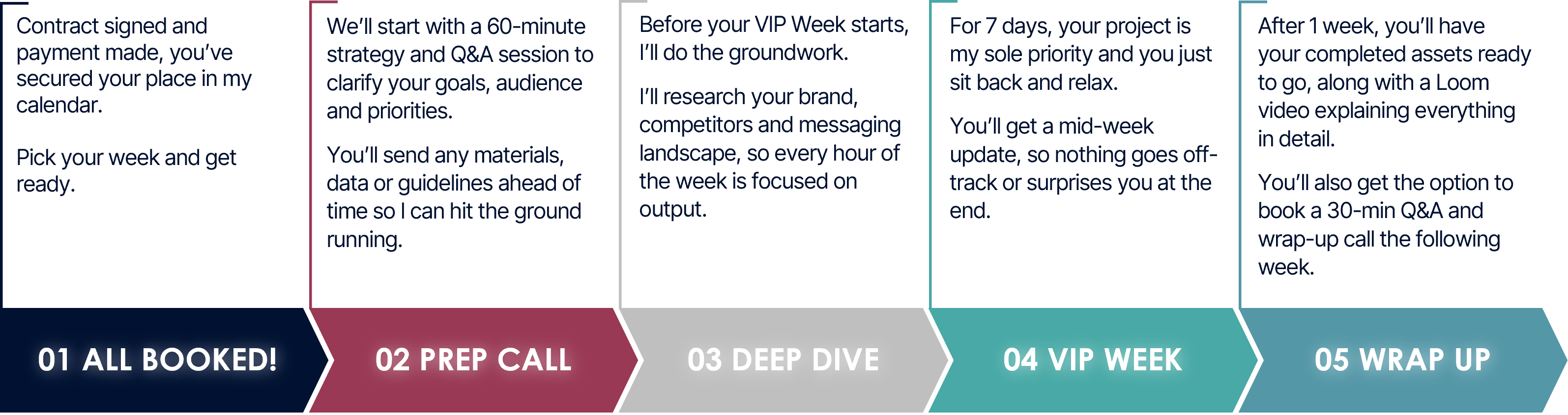 You’ll get one round of refinements included, plus support to answer any quick follow-up questions the following week. If you’d like me to take on additional work, we can extend into a second VIP Week or set up a retainer.